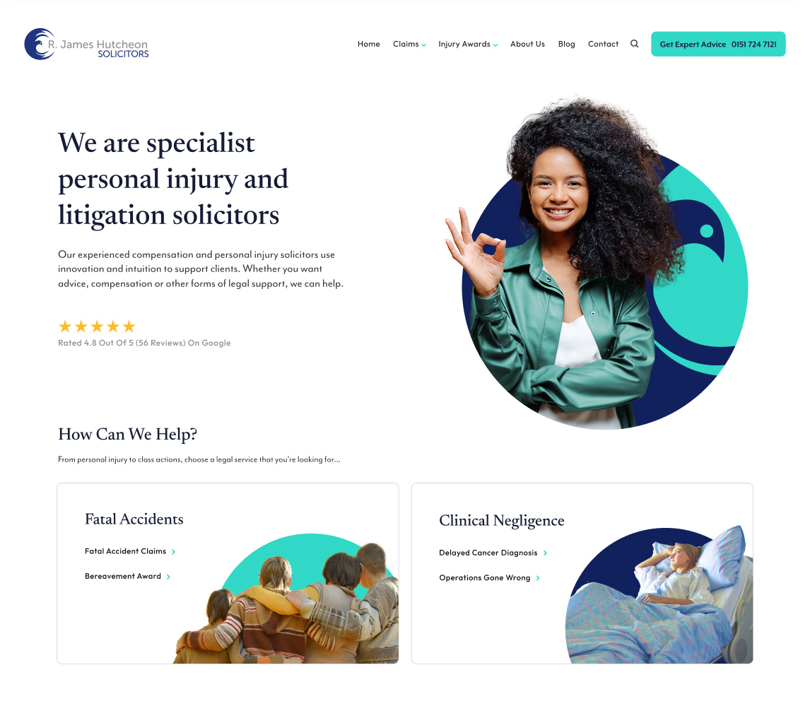 Navigation was a key focus—organising complex legal services into a clear, logical structure. Claims are neatly categorised, with dedicated pages for key areas alongside a standalone Class Actions section to showcase large-scale cases such as diesel emissions claims.